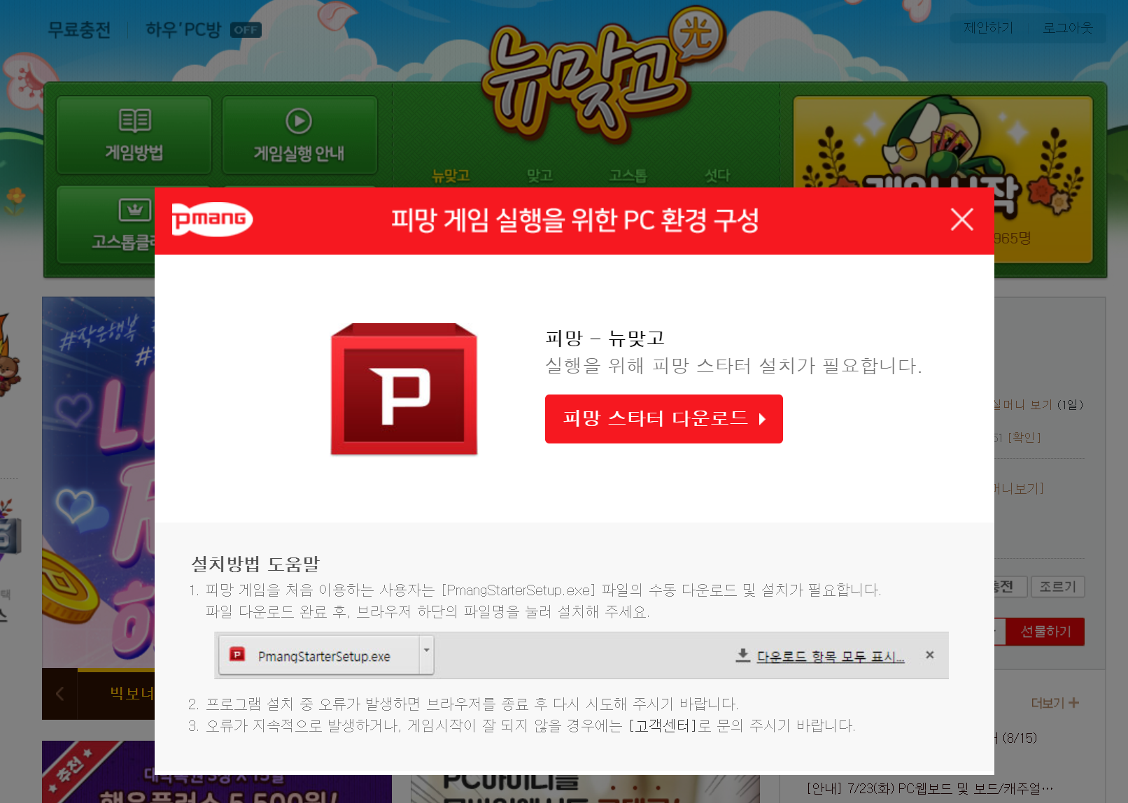 2. 만약 설치를 하다가 문제가 발생하면 브라우저를 종료하고 다시시작하면 됩니다. 혹시 계속 문제가 발생하는 경우에는 피망 고객센터로 문의를 주면 됩니다.